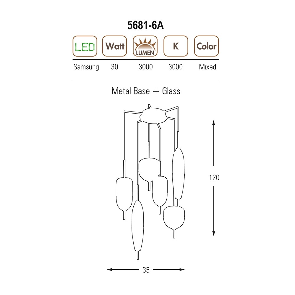 ÖZCAN AYDINLATMA 5680 SERİSİ G9*6 30W LEDLİ ÇİFT RENKLİ MIXED(KARIŞIK) CAMLI 6 LI SARKIT AVİZE 3000K SARI IŞIK (5680-6A)