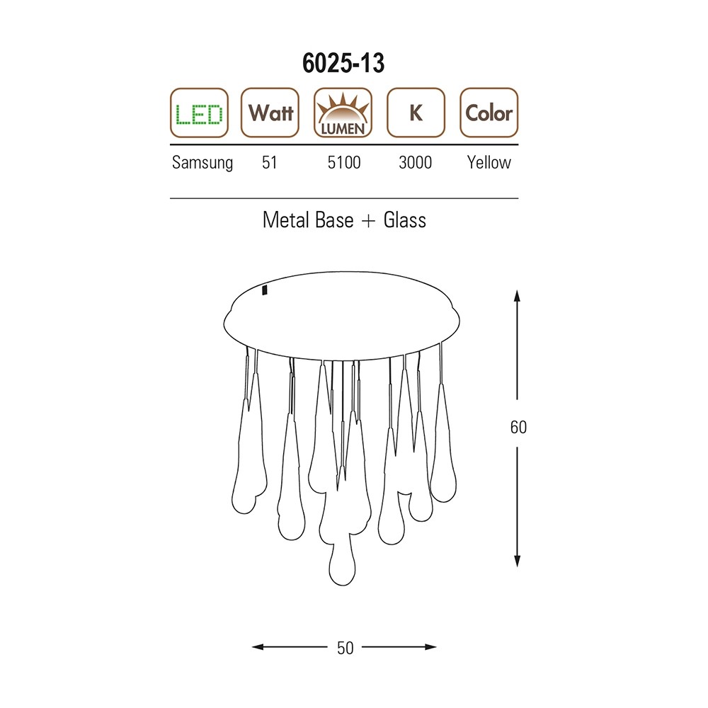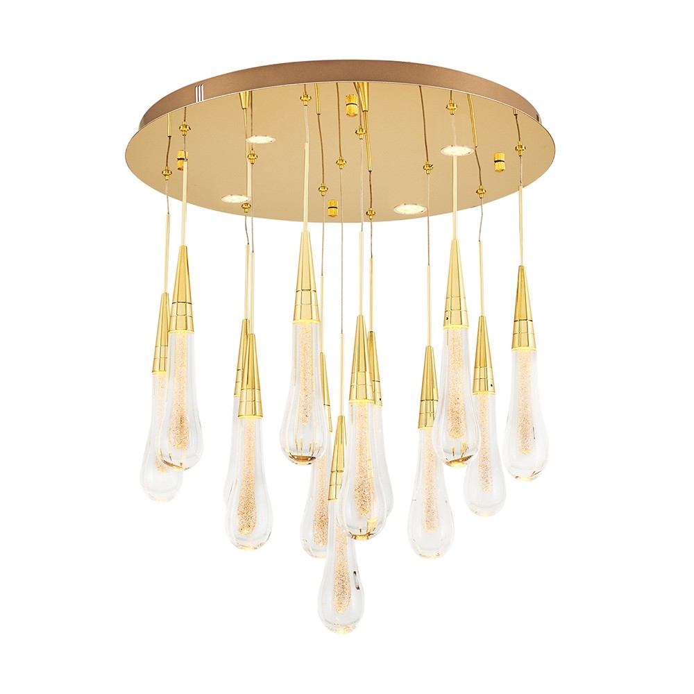 ÖZCAN AYDINLATMA 6025 SERİSİ 51W LEDLİ SARI(GOLD) GÖVDE 13 LÜ SU DAMLASI SARKIT AVİZE 3000K SARI IŞIK (6025-13A)