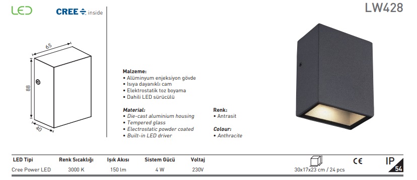 JUPİTER LW428 4W LED´Lİ DIŞ MEKAN DUVAR APLİK 3000K (IP54)