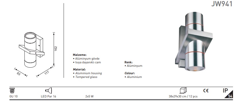JUPİTER JW941 2XGU10 BAHÇE APLIK (IP54) (AMPUL HARİÇTİR)