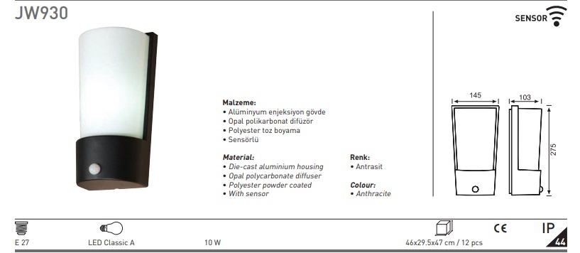 JUPİTER JW930 E27 BAHÇE APLIK - SENSORLÜ (IP44) (AMPUL HARİÇTİR)