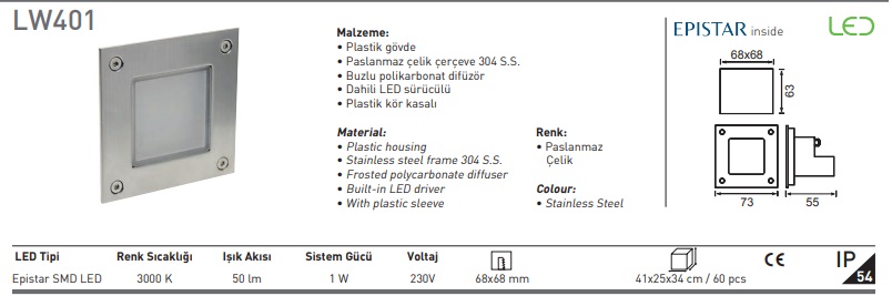 JUPİTER LW401 1W LED MERDİVEN ARMATÜRÜ 3000K (IP54)
