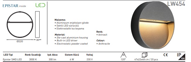 JUPİTER LW454 6W LEDLİ BAHÇE APLİK 3000K (IP44)