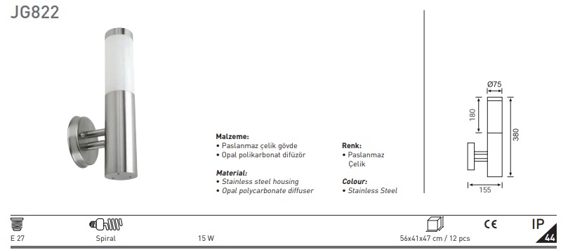 JUPİTER JG822 E27 DUYLU PASLANMAZ BAHÇE APLIK (IP44) (AMPUL HARİÇTİR)