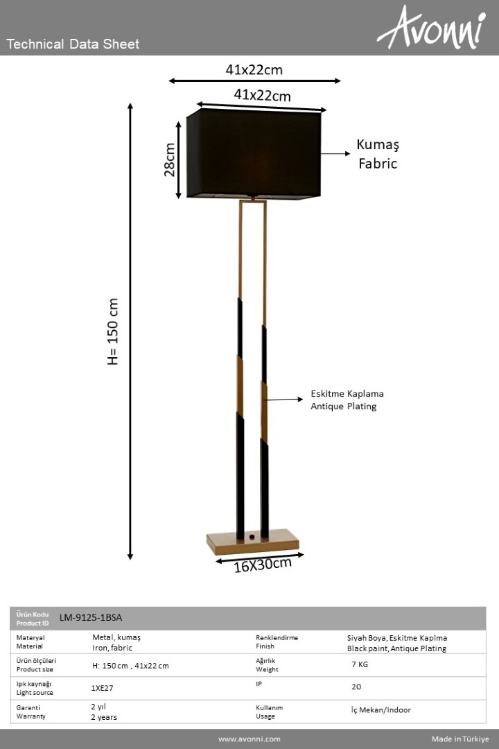 Ürün Adı: AVONNI Siyah/Eskitme Boyalı Lambader E27 Metal Kumaş 30x22cm