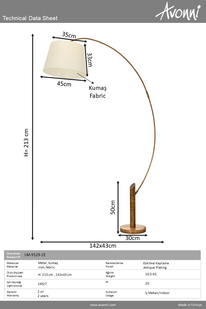 Ürün Adı: AVONNI Eskitme Kaplama Lambader E27 Metal Kumaş 43x152cm