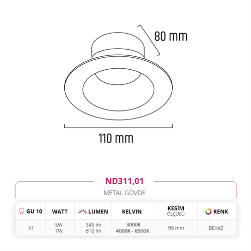 Işık akısı : 5W - 345 LM / 7W - 610 LM